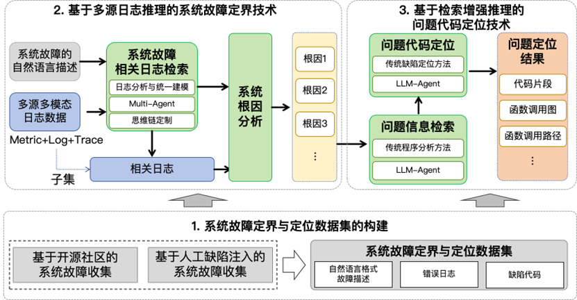 Modern systems generate massive, heterogeneous logs that are essential for diagnosing failures but difficult to analyze reliably by hand. With the rise of Large Language Models (LLMs), we investigate intelligent fault scoping and localization by combining multi-source log reasoning and code analysis. We will: (1) build an end-to-end evaluation dataset covering problem descriptions, system logs, and code snippets; (2) develop multi-source log reasoning methods that integrate traditional log modeling with multi-agent LLM reasoning to retrieve fault-related logs and analyze root causes, precisely mapping failures to system modules with clear explanations; and (3) propose retrieval-augmented reasoning for code-level localization, leveraging classic program analysis (e.g., test-based fault localization) to gather evidence, retrieving relevant program knowledge, and using LLM agents to synthesize a final answer as faulty code snippets or call graphs/paths.