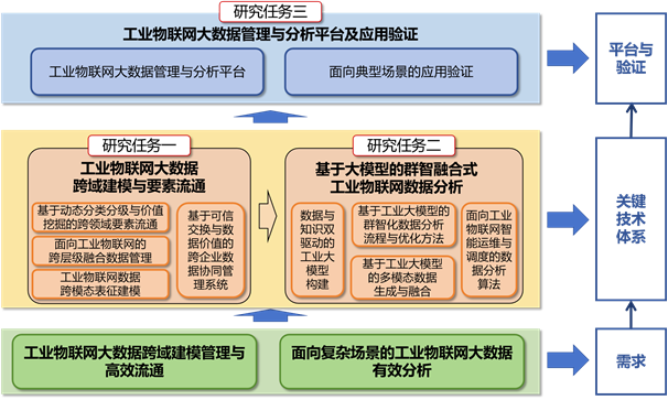 This project focuses on multimodal big data modeling and analysis for Industrial Internet of Things (IIoT), addressing critical application challenges arising from cross-layer, cross-domain multimodal data in industrial IoT systems. The main challenges include difficulties in modeling and management due to multimodal data complexity, lack of industrial mechanisms in large models, and insufficient generalization capabilities of small models leading to ineffective analysis. The project aims to tackle two fundamental scientific questions: "How to improve data circulation capabilities in Industrial IoT through hierarchical modeling management" and "How to enhance the effectiveness of Industrial IoT data analysis through collective intelligence fusion methods." We will break through six key technologies: cross-modal data representation modeling, cross-layer data fusion management, cross-domain data tiered pricing, dual-driven industrial large model construction combining data and knowledge, collective intelligence fusion data analysis based on industrial large models, and intelligent operation and scheduling algorithms for Industrial IoT. The project will develop an Industrial IoT big data management and analysis platform, with application validation across five typical aerospace industry scenarios. This comprehensive approach will significantly advance the state-of-the-art in industrial IoT data processing and analysis capabilities.